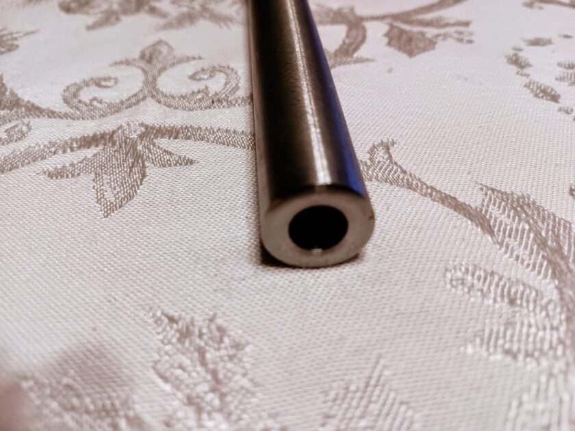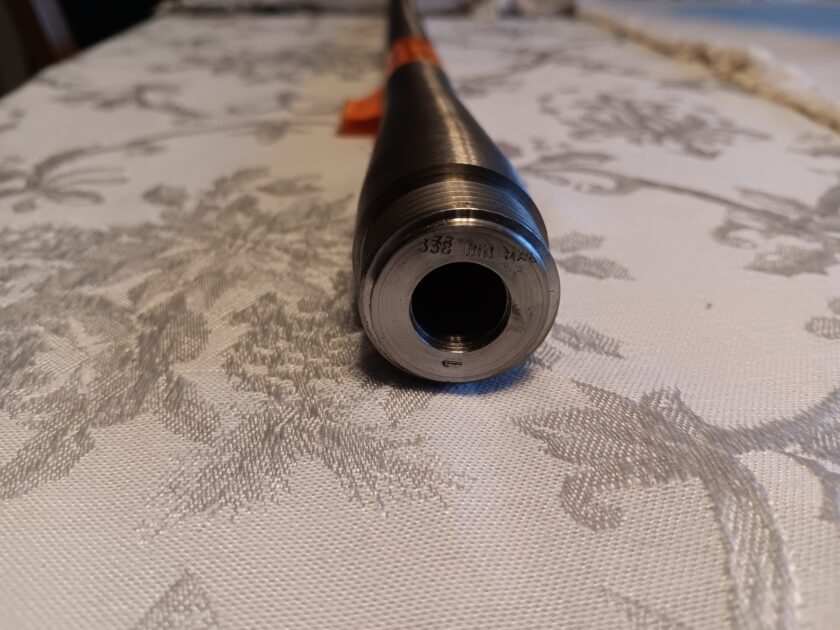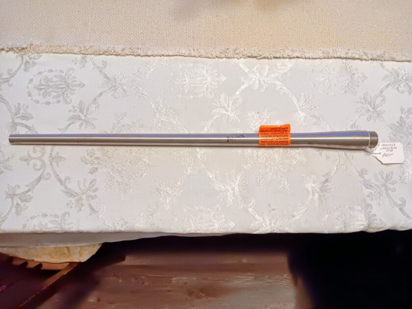338 Win Mag short chambered chrome molly Mauser Large Ring barrel. New old stock. 24″ 6 grove, measures 1.20″ to .650 at muzzle. Unknown manufacture, both Shilen and Criterion were known to use these orange tags.