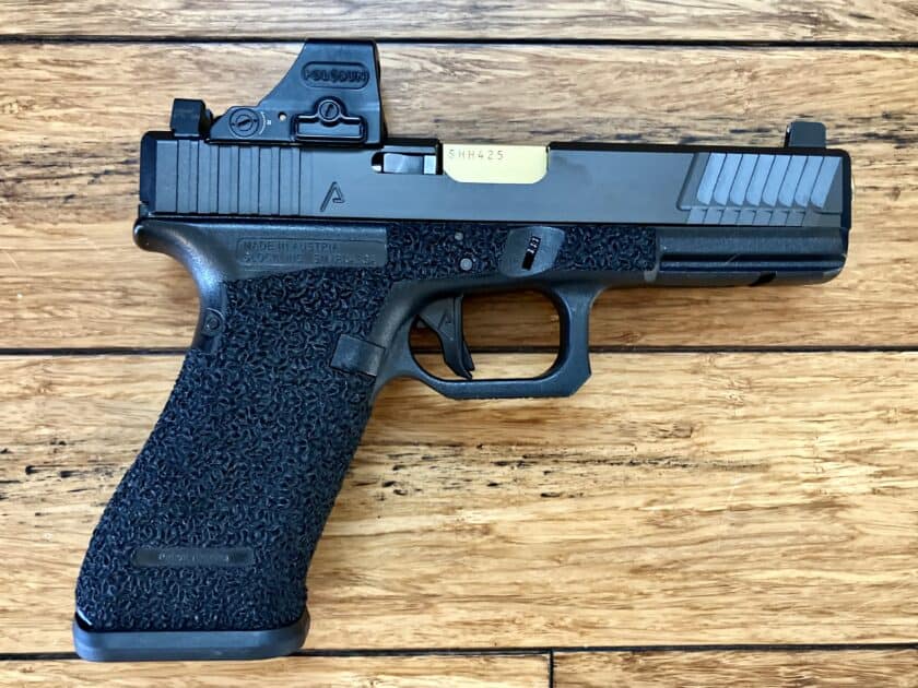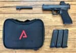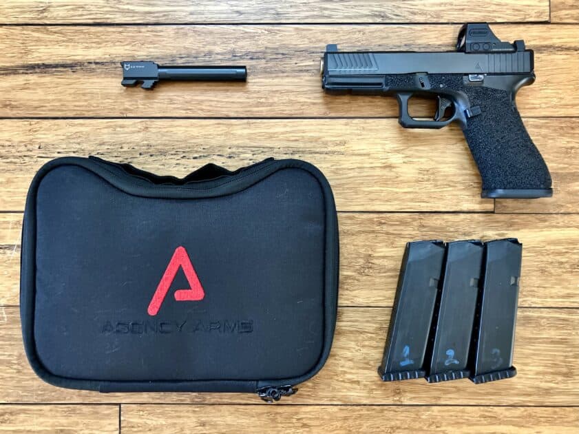 Agency Arms Glock 22 Gen4. This .40 handgun is in good condition, comes with a Magpul magwell and Holosun 508T-RD X2 installed. OEM barrel is TiN coated and suppressor height night sights are installed. Also comes with a new Lone Wolf 9mm conversion barrel, Agency Arms soft case, and three OEM magazines with SLR baseplates.