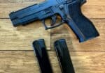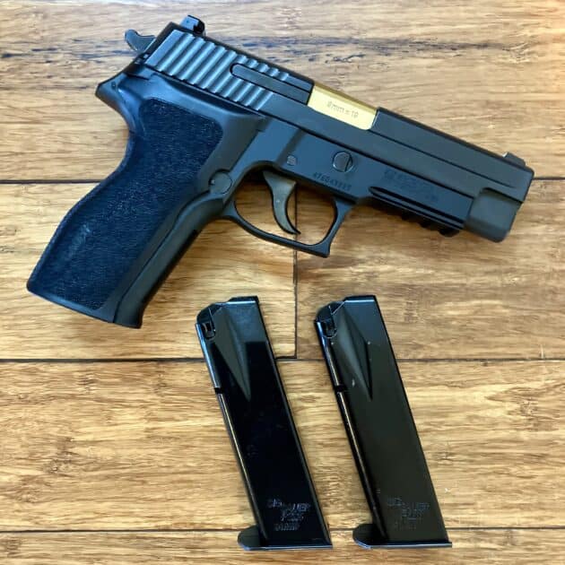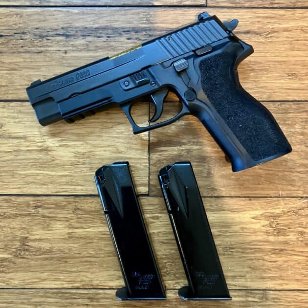 Sig Sauer P226 E2. This 9mm handgun is in good condition and comes with two 15rd magazines. OEM barrel is TiN coated. Non-night sights are installed.