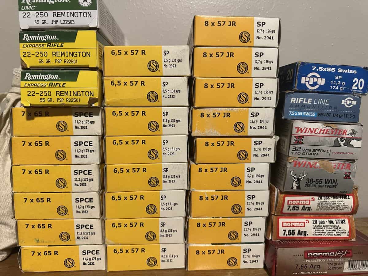 7,5X55 Swiss 33 rounds in the 2 boxes. 174 gr. $30