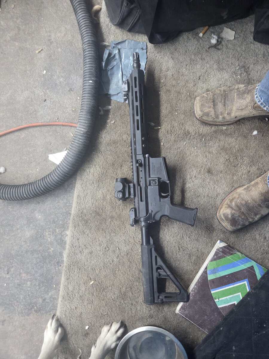10 inch bear creek upper, radical arms lower. Has light, sling points and a shake awake red dot, was 70$ on amazon, feyachi i think? Also has cheep flip up sites. Four06-8ninenie-486four text preferred. Thanks.