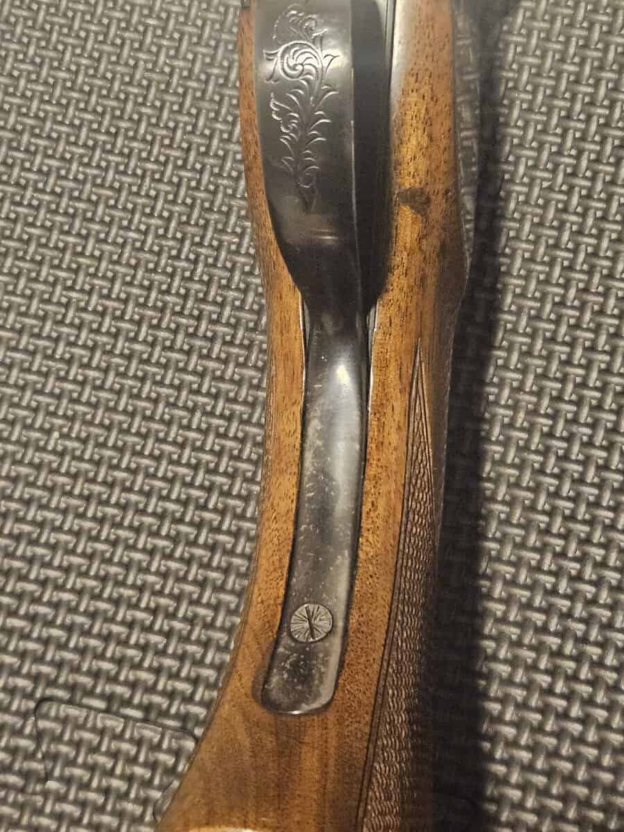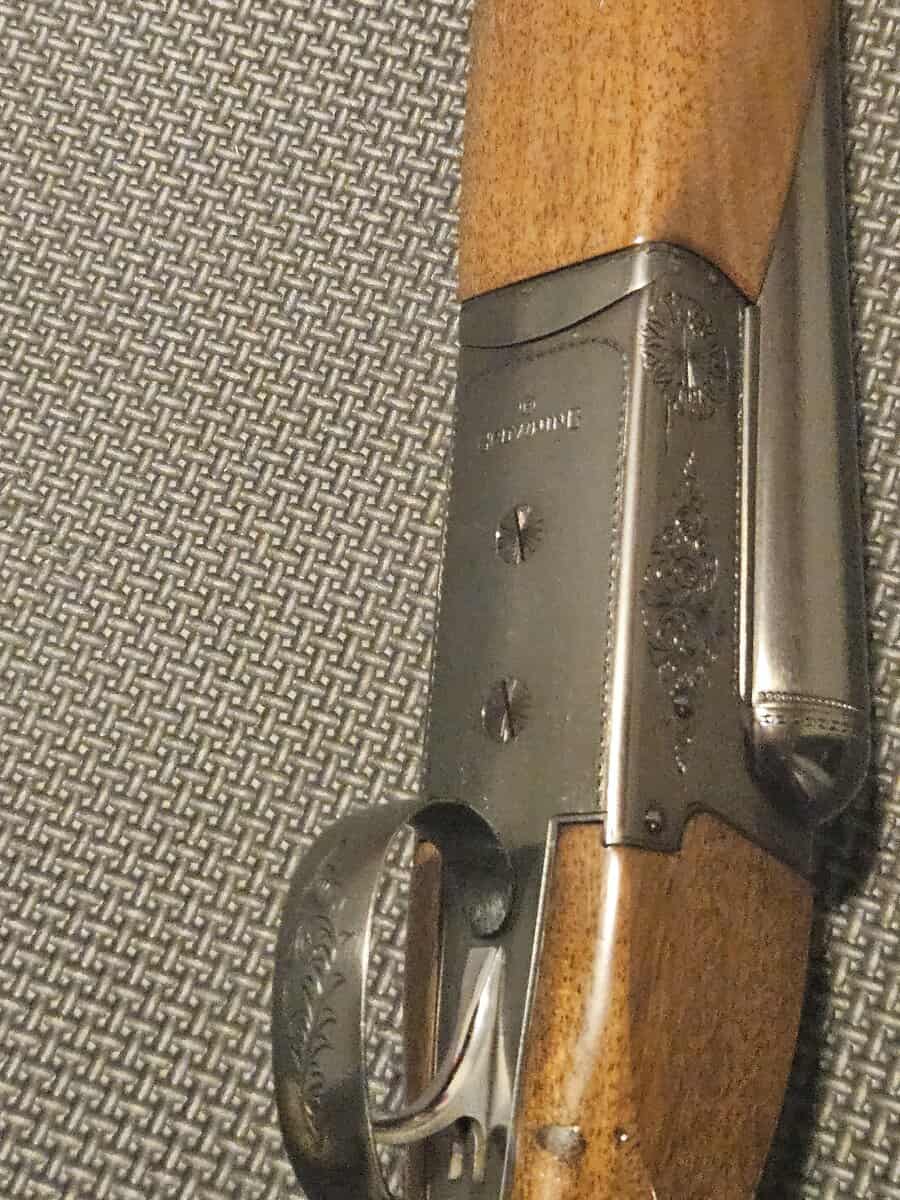 Barrels are in great shape with bright, clean bores. Action is tight with solid lockup. Checkering is sharp and the gun has been well cared for overall. Bluing is in good condition with only light handling wear in a couple spots pictured (behind trigger guard and near safety and on edges under forend). Otherwise bluing is immaculate.