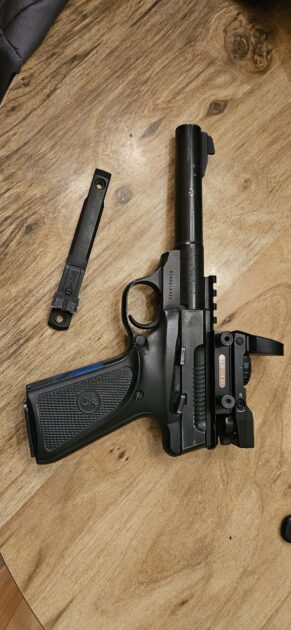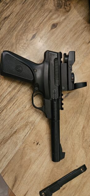22 lr target pistol. Shows signs of wear, but its a good shooter. Topped with a truglo red dot sight, and comes with original rear open sight.