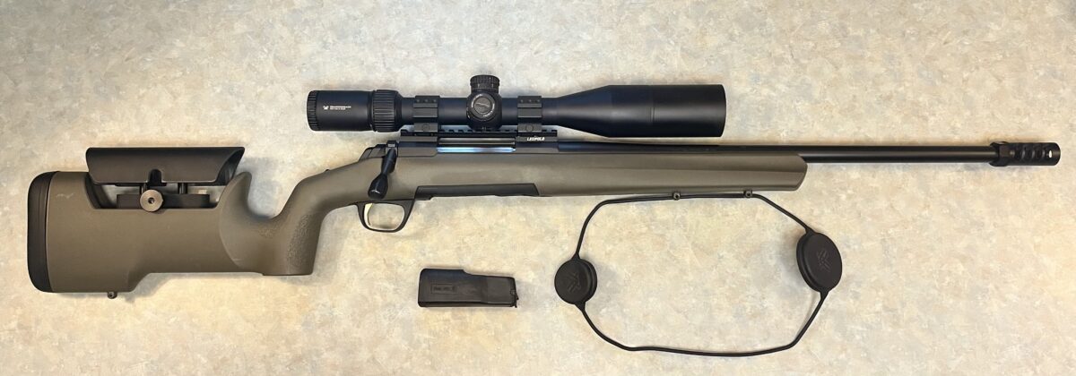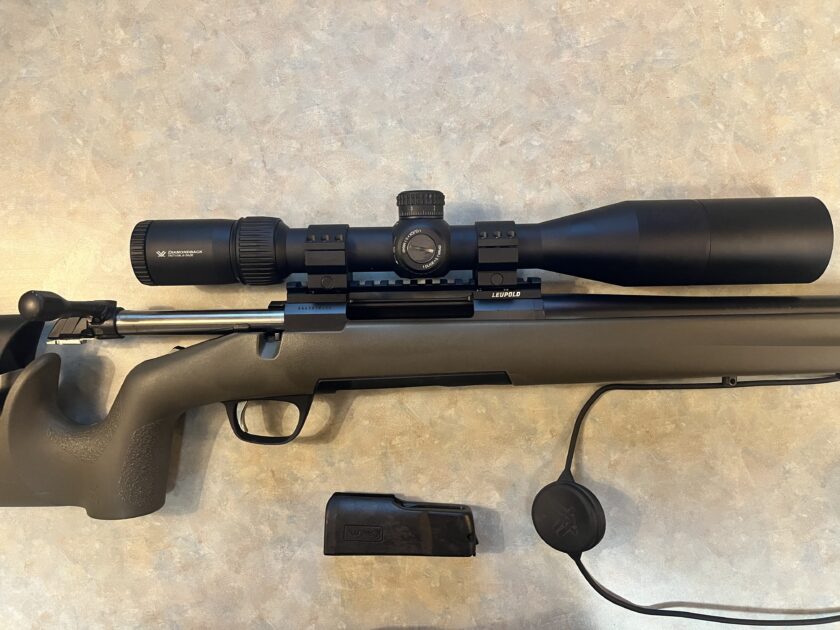 Vortex Diamondback Tactical 6-24×50 FFP with sun shade mounted on a one-piece Leupold Backcountry pic rail with Vortex Tactical 30mm rings.