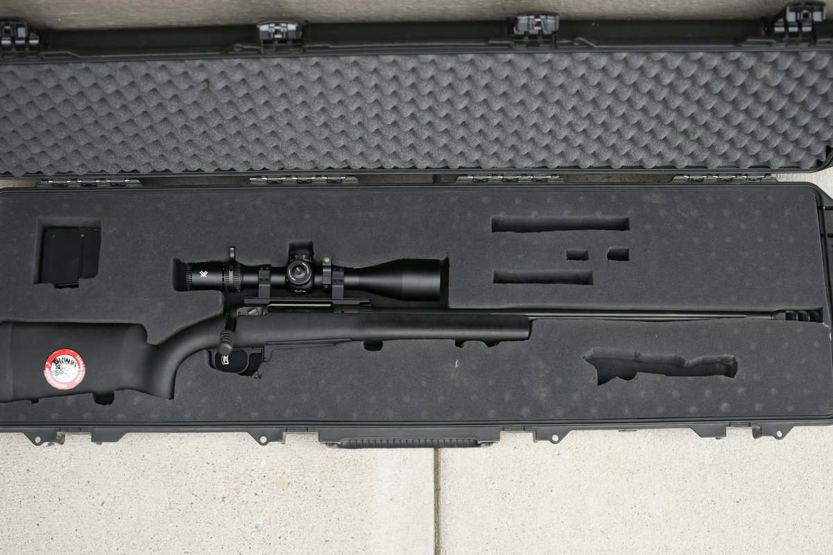 Savage 110 FCP 338 lapua, comes with everything you need to start shooting long range. Pelican IM3300 hard case, dies, shell holders, 97 pieces of brass, and several hundreds bullets for reloading (mix of hunting and target bullets). Added the bigger 110 BA bolt handle. Scope is a vortex venom 5-25 MRAD. Scope can stay on it to stay sighted in unless you don’t need the scope.