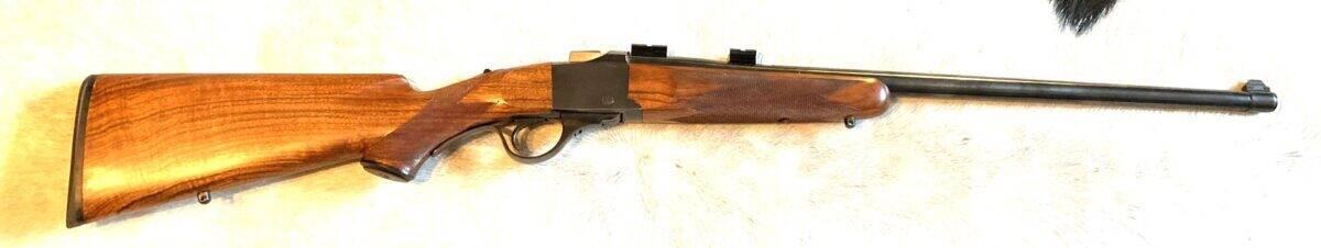This is a custom 30-40 Krag, built on a Ruger No. 3 falling block single shot action and factory barrel. Action tolerates higher pressures than the classic Krag 1898, so can be loaded to velocities approaching .308 Win. And this particular rifle shoots these faster loads VERY well. Ready to scope. Restocked in fine French walnut, raised cheek piece, matching forend, shortened lever, metal grip cap. Comes with new brass and RCBS dies. More pics available on request. Prefer FTF cash sale near Missoula to legal Montana resident. Shipping negotiable.