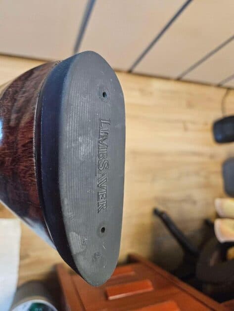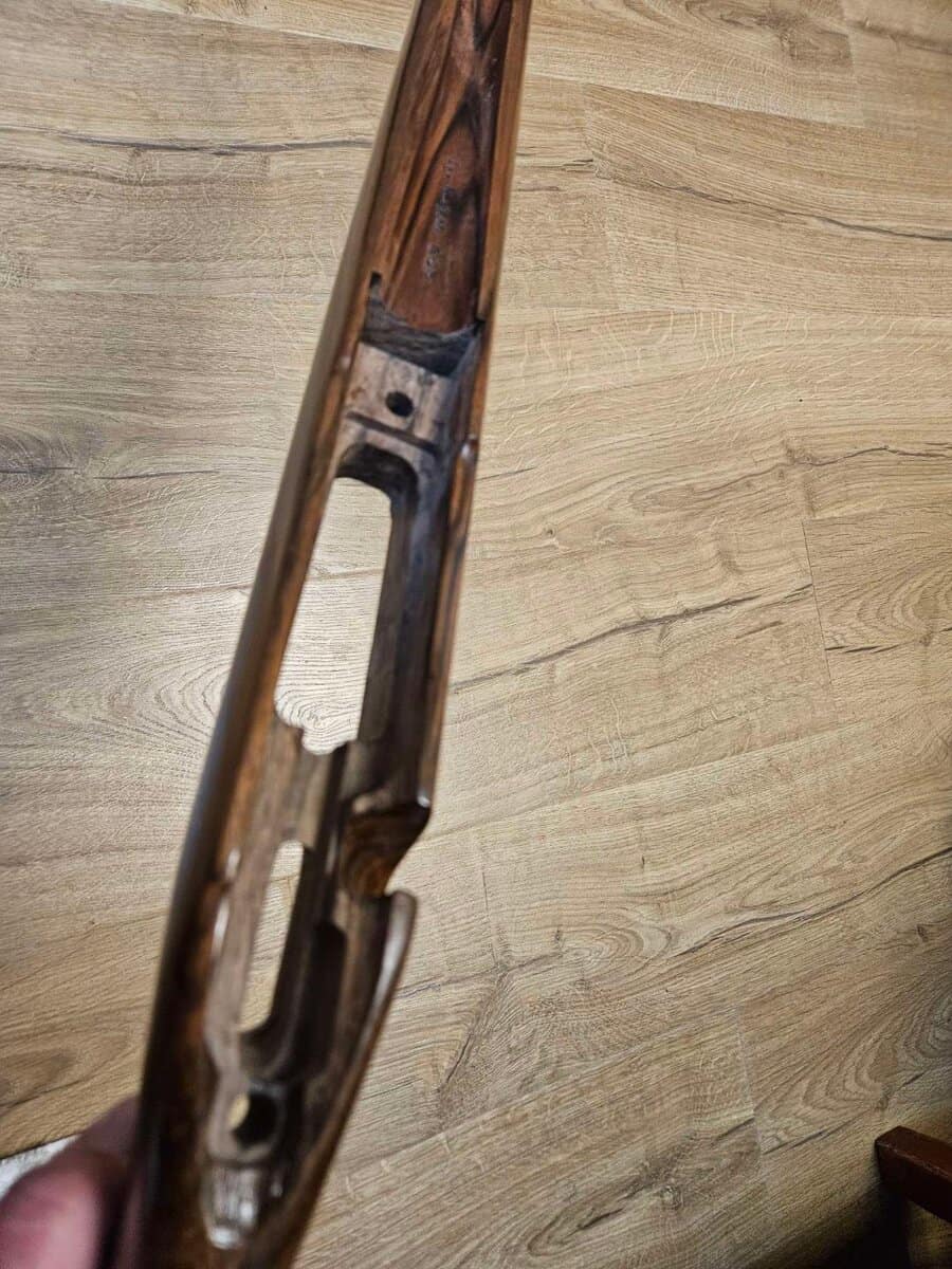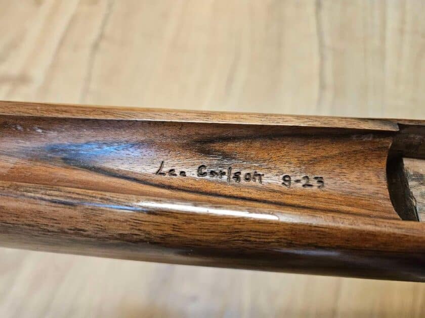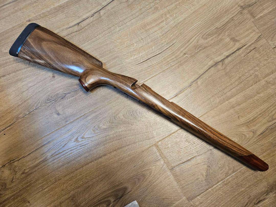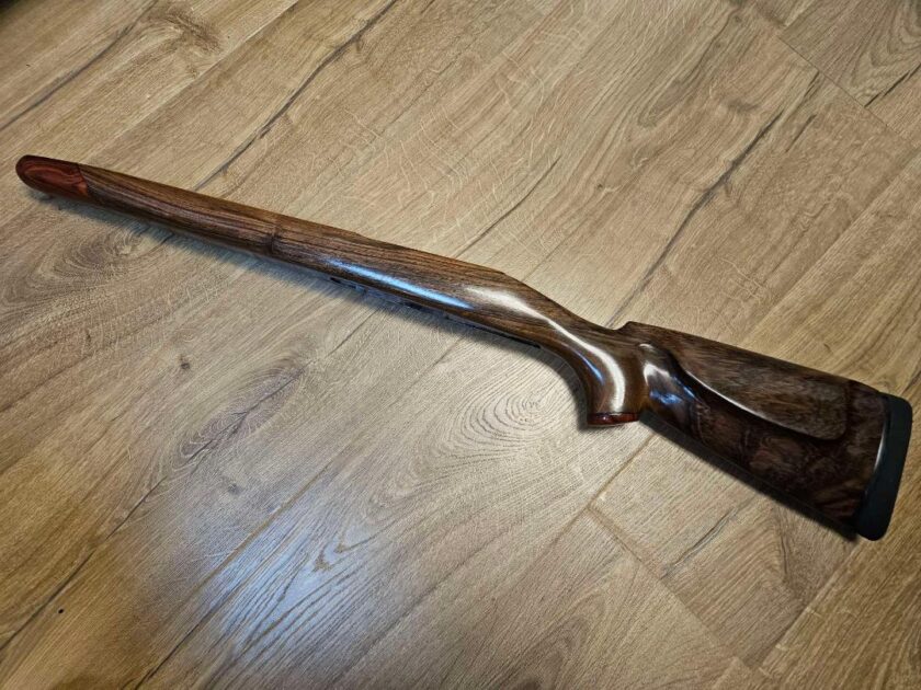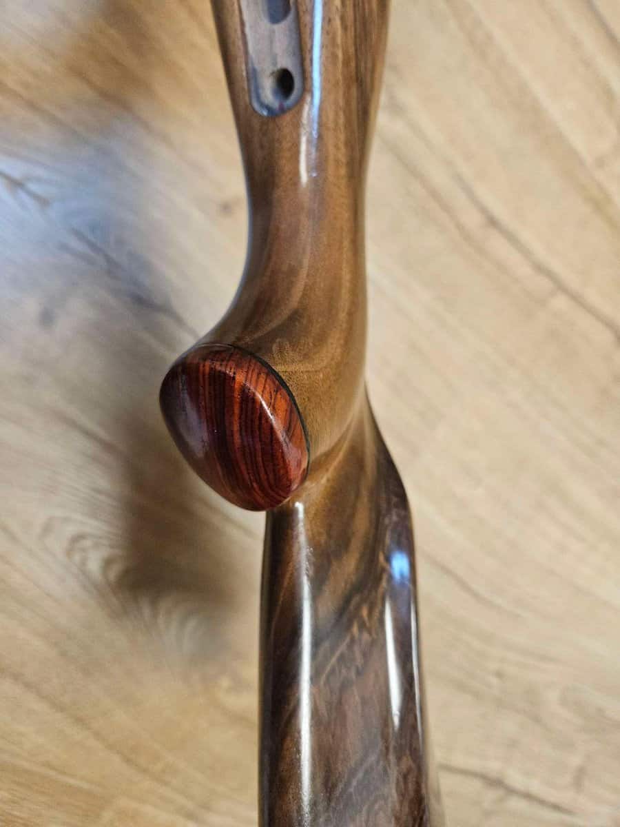 Custom wood stock for Winchester Model 70. Rosewood tip and grip end. Limbsaver recoil pad.
