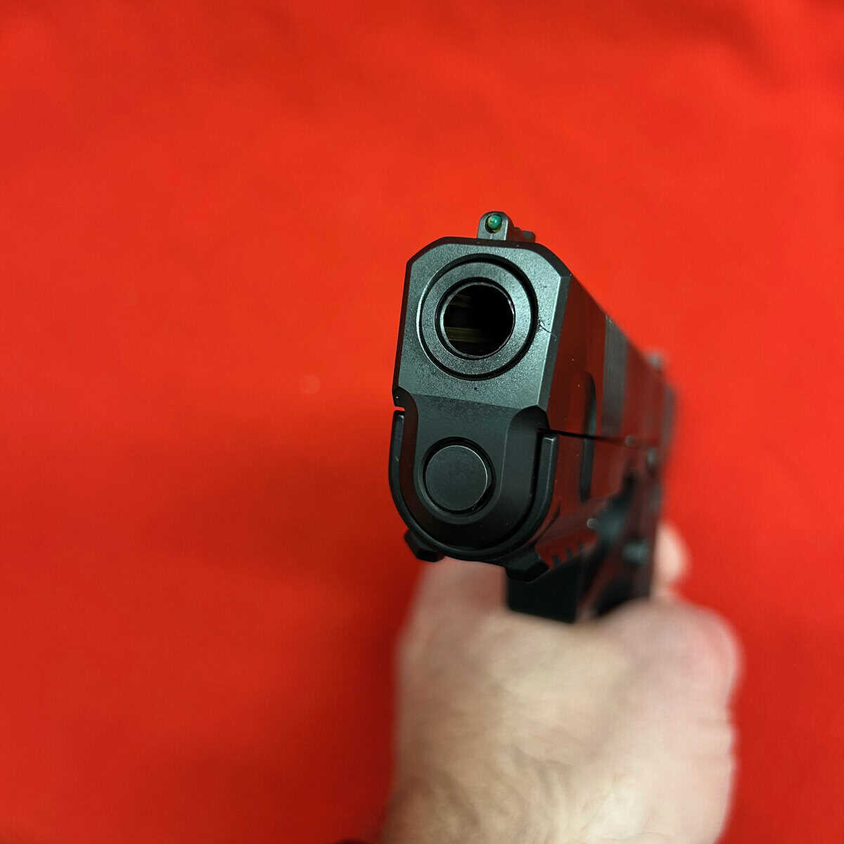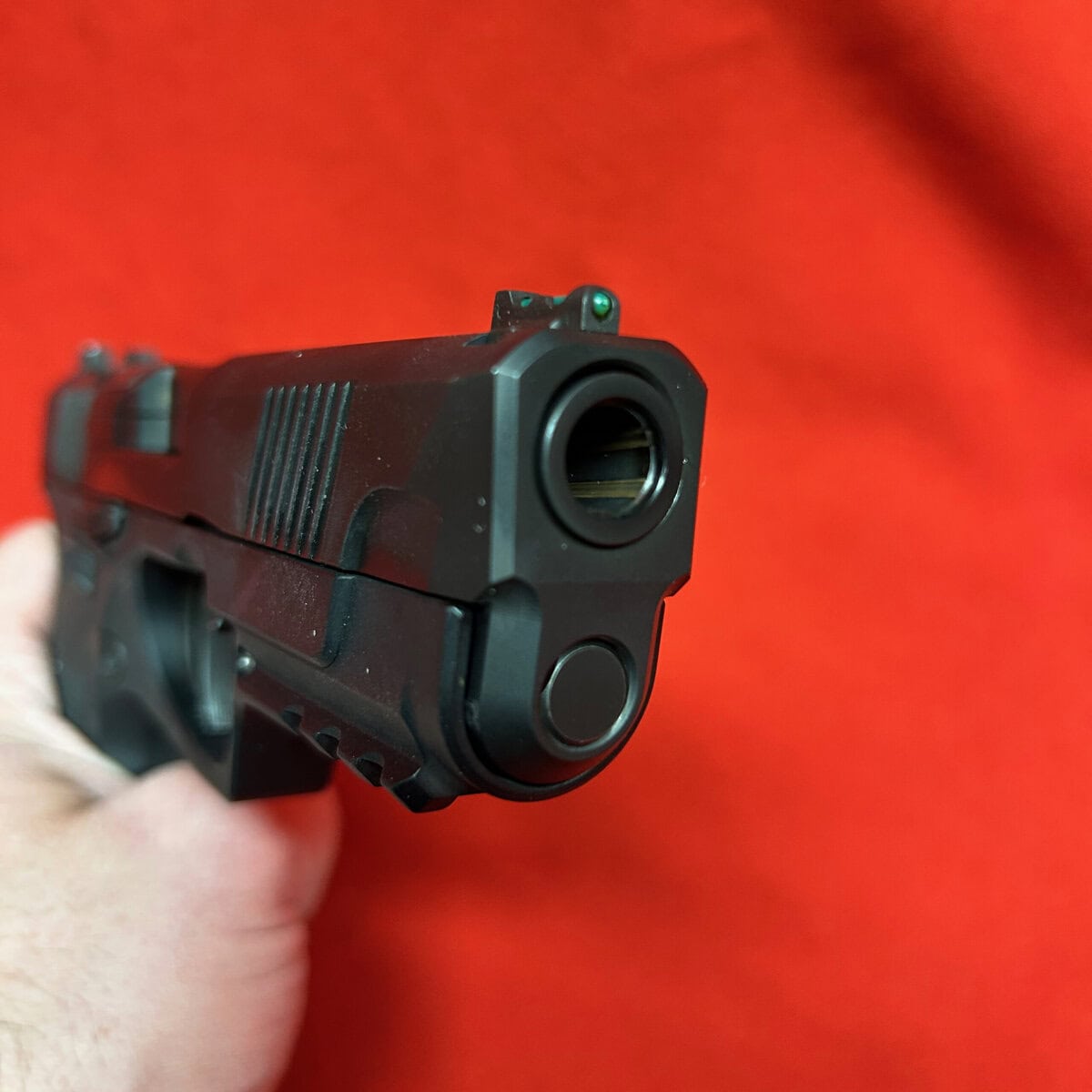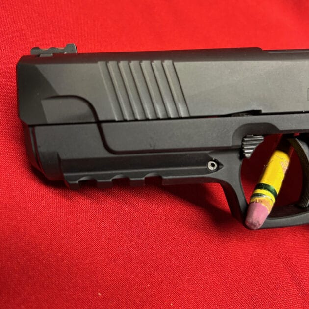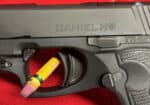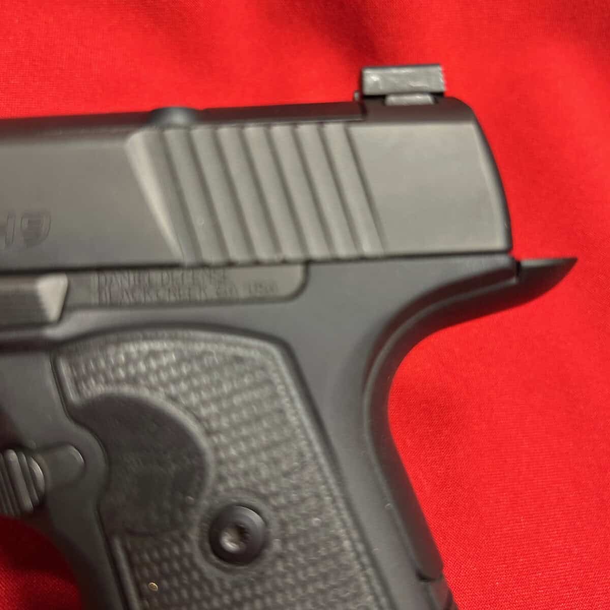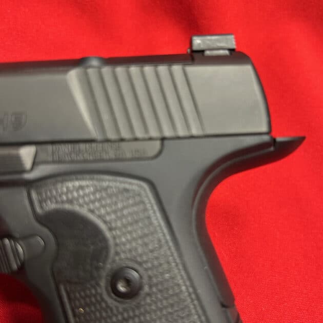 This is a slim 1911-style pistol with a unique straight pull trigger with a trigger safety. It is only 1″ wide and has a super low bore axis.