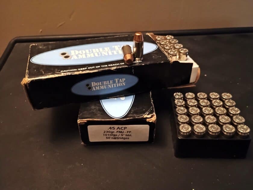 I have a total of 125 rounds of Doubletap ammo 45 ACP 230 grain fmj flat point rounds. These rounds are have an advertised velocity of 1010 feet per second. Doubletap sells these as dangerous game defense rounds for hiking in the woods etc. These are the older version of these rounds. The current version is advertised as 1000 feet per second are not loaded in nickel cases and sell for $25.90 for 20 rounds. I have two 50 round boxes and 25 rounds that are in an old Remington Golden Saber box. The rounds are all the same regardless of packaging.