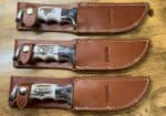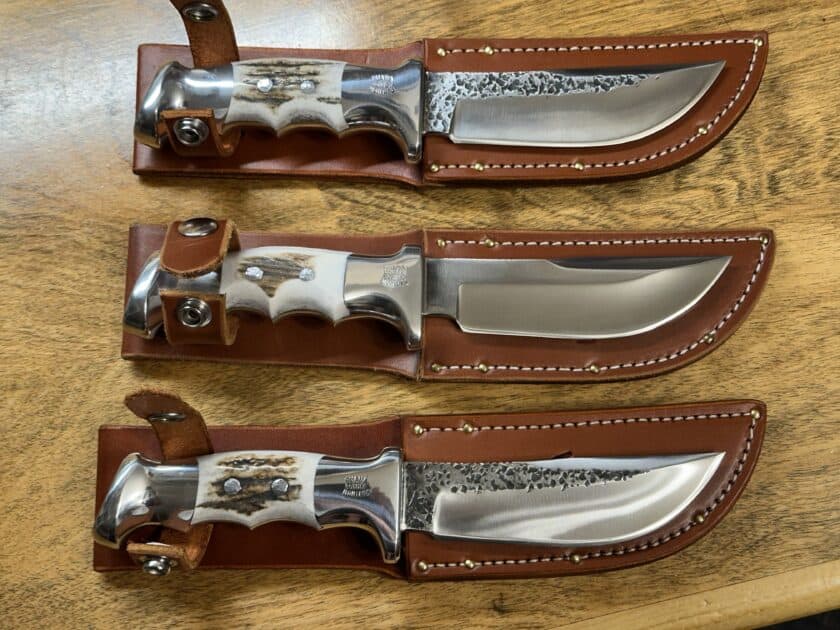 One 20B Special Custom Ordered Flat Grind Skinner Blade, Two Special Order Custom Hollow Ground with Hammer Marks, One Special Order Hollow Ground with No Hammer marks. All with Special Custom Ordered Old School Standard Knife Sheaths.