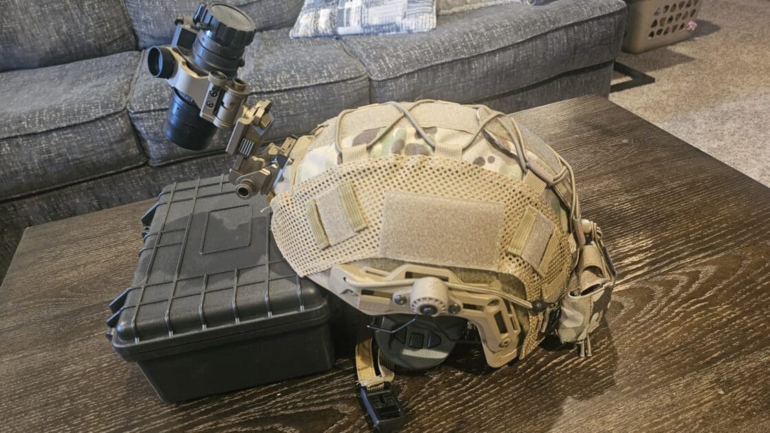 PVS-14 with White Phos tube from Custom Night Vision. HHV ballistic helmet (large). MSA Sordin supreme pro x headset mounted on helmet. Comes with everything you see.