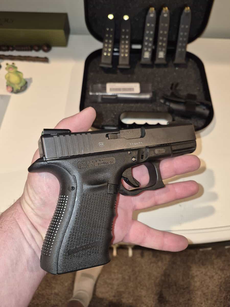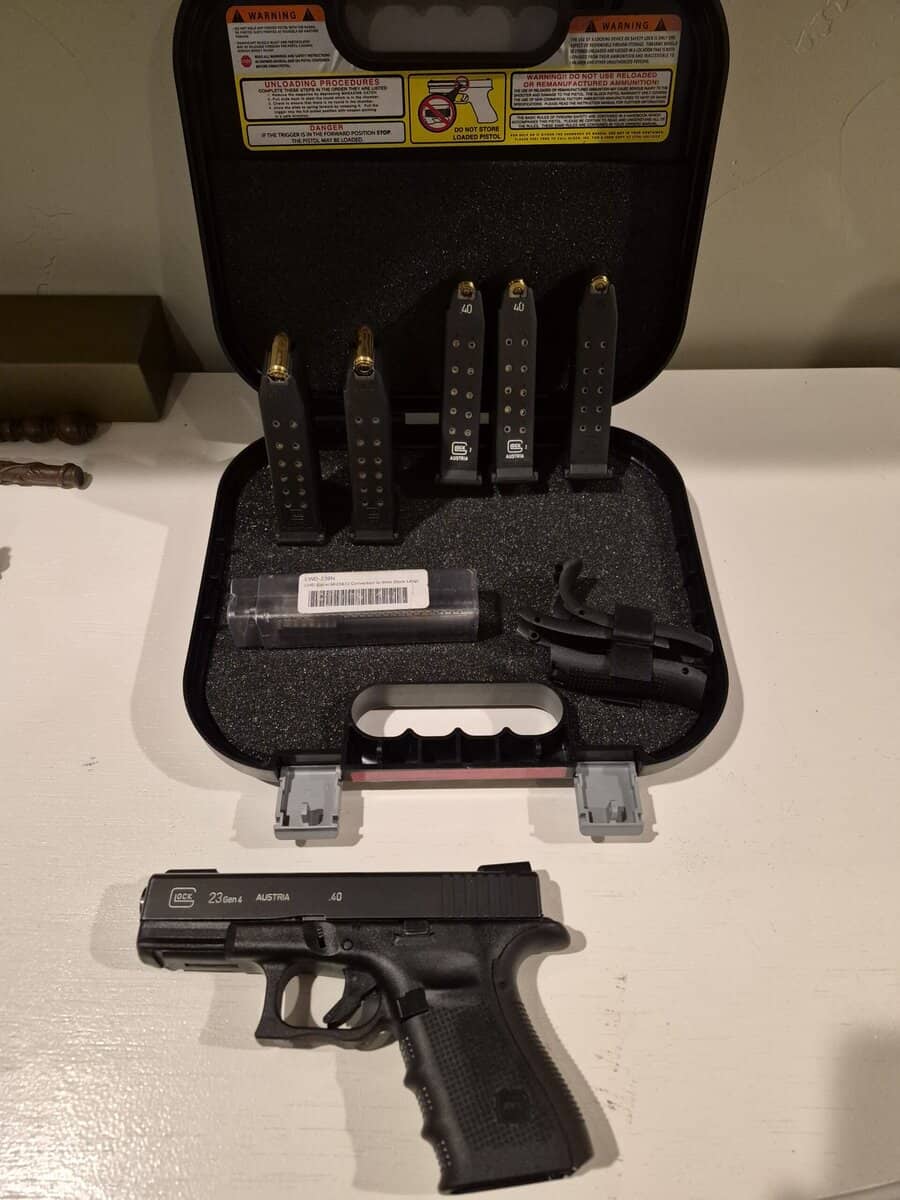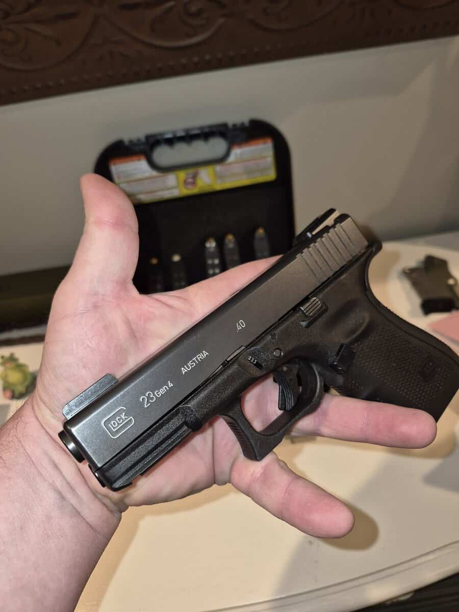 Great condition Glock 23 Gen 4 .40 cal. Original box, beaver tail accessories, 9mm barrel, 3 40 cal mags, 2 9mm mags,Truglow sights. Also have alien gear belly holster and Blackhawk shepa paddle holster. Asking $450 for all, or would use as partial trade twords a 280 AI rifle if someone was interested.