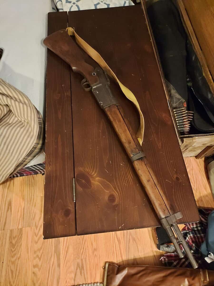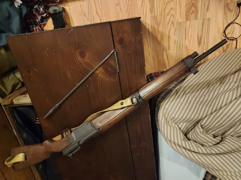 MAS-36. The bore on this one is rough, but it does shoot… about 8″ at 100yds. Original new-old stock French sling and bayonet.