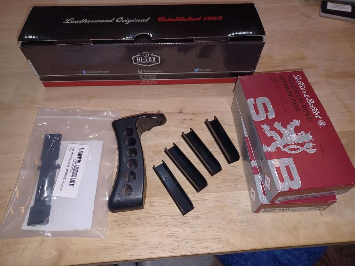 MOSIN NAGANT parts. Leatherwood 2-7 BDC scout scope. BADACE rear sight mount, box &1/2 S&B 174gr HPBT, rubber recoil pad, & 4 stripper clips. Paid over $200. Asking $150