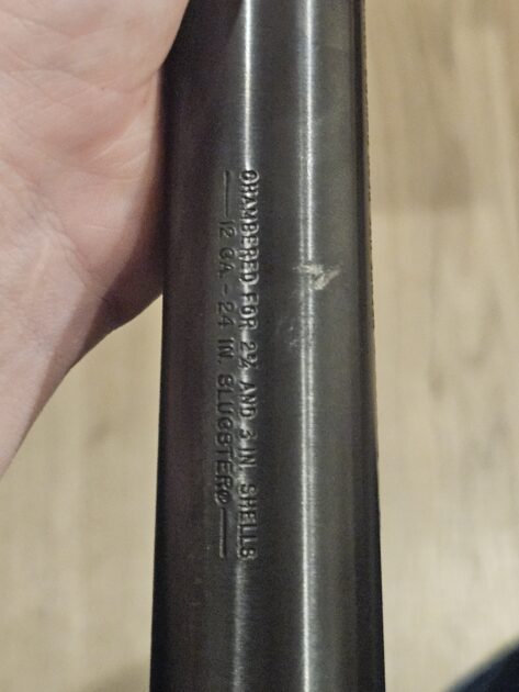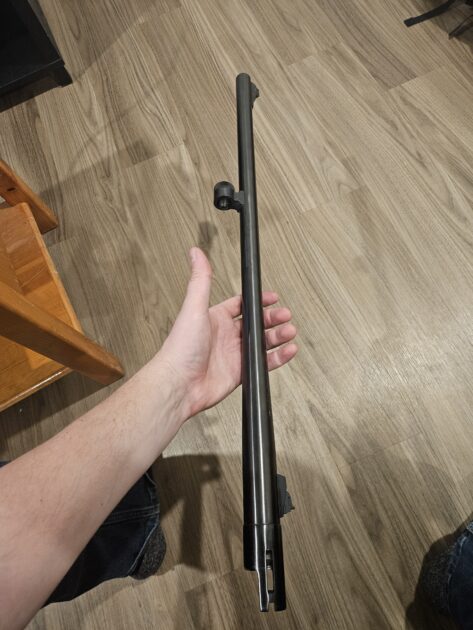 Excellent condition mossberg 500 smoothbore slug barrel. Bluing is great- only mark I can find is the one pictured on top of the barrel. Bore looks great, maybe could use a slight cleaning but definitely no corrosion. Will take 2.75 or 3″ shells. Got it with the intention of using in firearm restricted areas but I like using my muzzleloader or bow. $125 firm. This is a low price for this barrel.