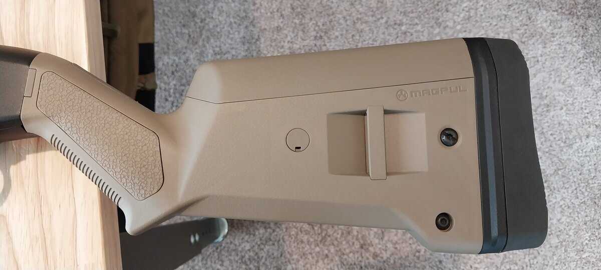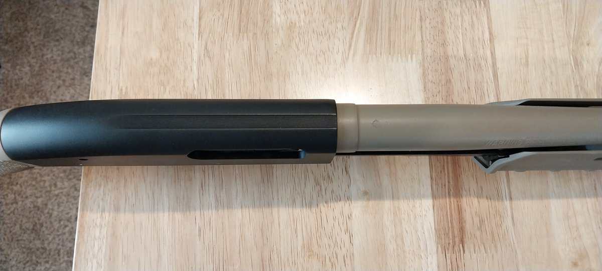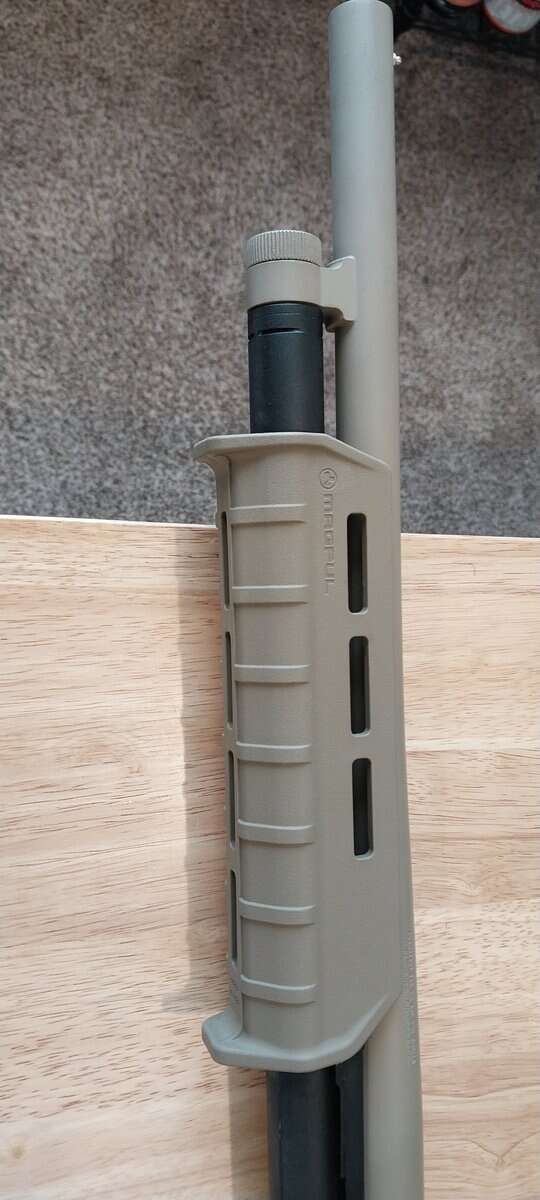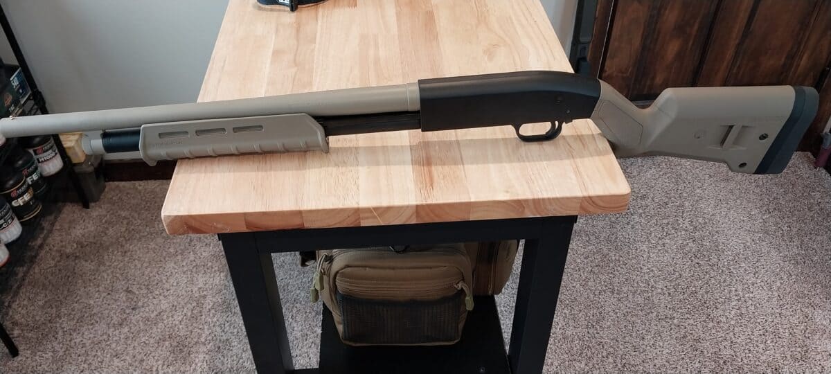 I’ve had this shotgun for many years, since owning it, I have replaced the factory blued barrel with a Mossberg FDE barrel (18.5″), installed Magpul furniture on it as well as painted the reciever with Brownell’s Alumahyde paint which turned out really nicely.