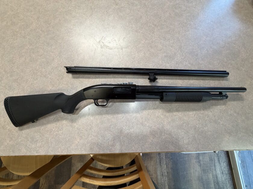 Like new Mossberg Maverick 88 shotgun combo– 18.5″ and 28″ barrels included. Bought this gun last year, probably run 50 rounds through it total. Decided I’m going to get a gas gun for clays instead.