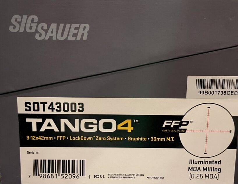 (used) Sig Tango4 3-12x42mm, few small rub marks on gray finish, glass is perfect, FFP, Illuminated MOA Milling reticle, comes with factory box, owners manual, and a set of butler creek flip up scope caps. $400