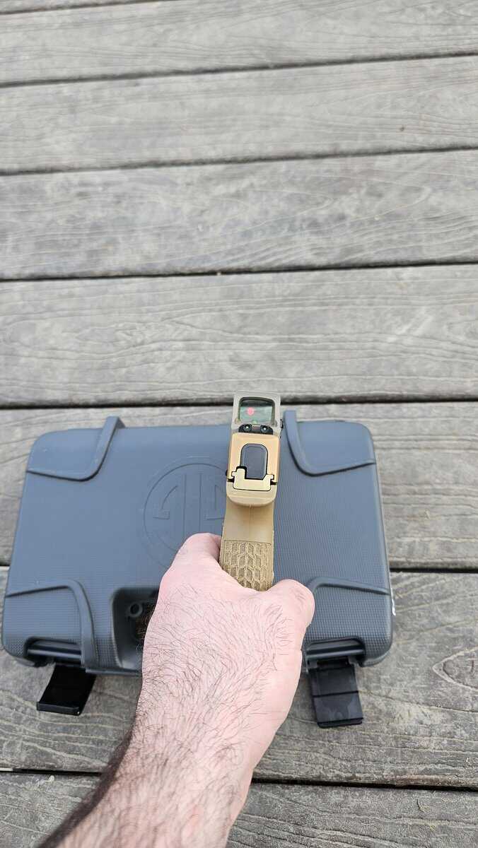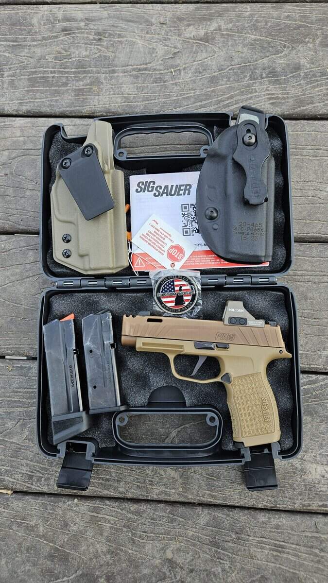 1) P365 Spectre Comp. Original owner. Comes with 2 x 12 round and 1 x 17 round mags, original case/coin, 2 IWB holsters, and a matching FDE Holosun 407k red dot. Great little shooter, just not getting carried as much as it deserves.