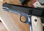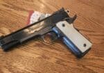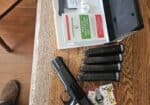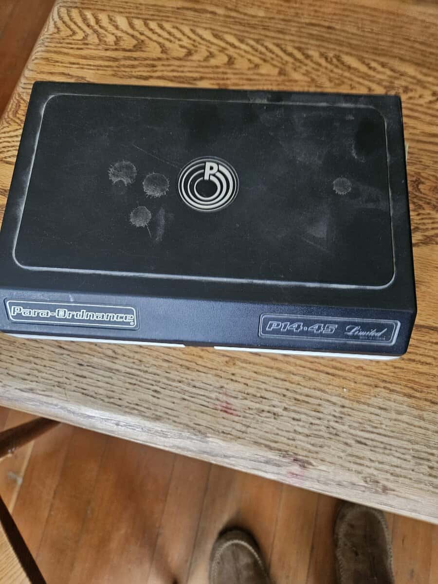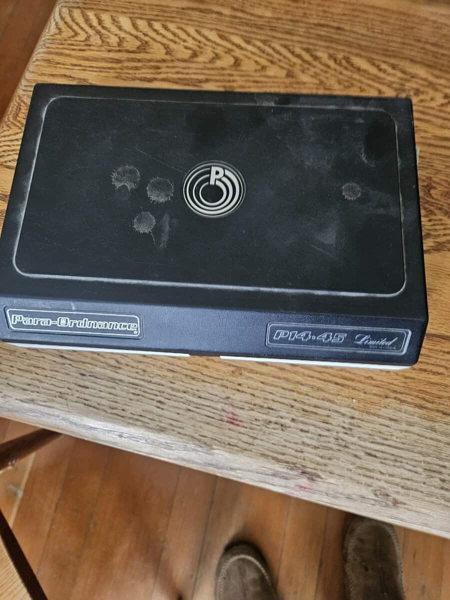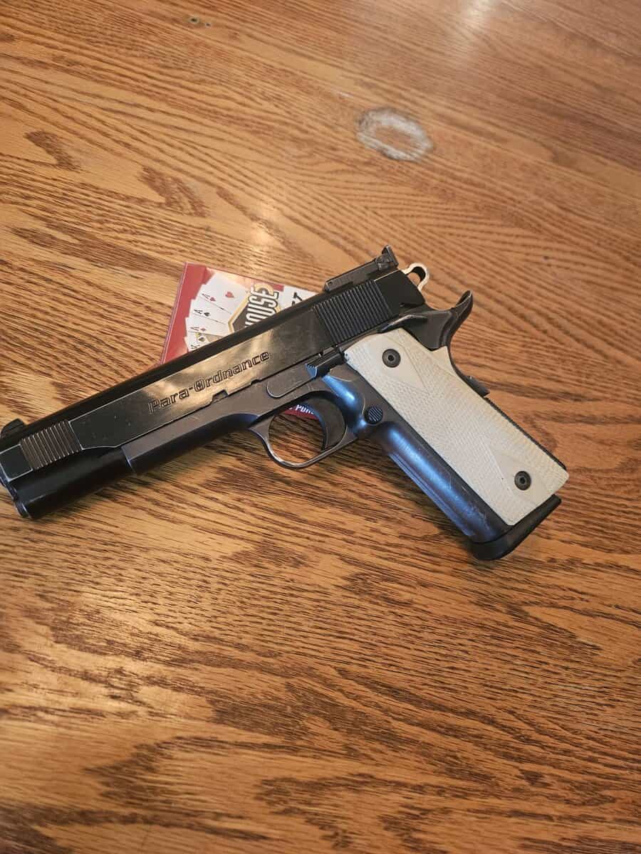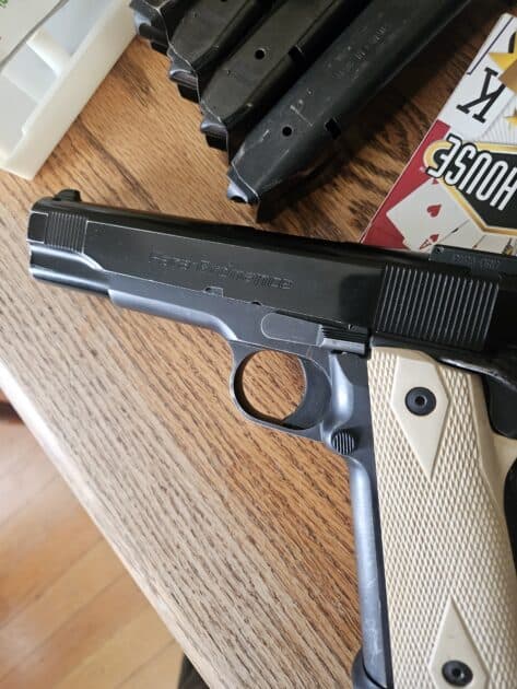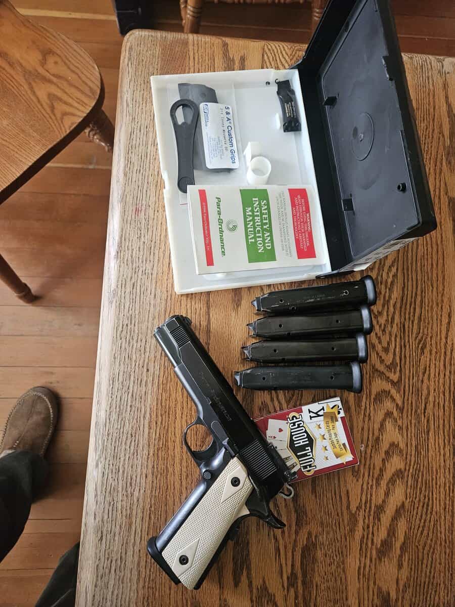 45acp I have 5 magazines that hold 14 rounds, original box with take down tool, extra grips. This is a 1911 that holds 14+1 rounds it comes with a kydex holster, 380 rounds of fmj brass case ammo and 65 rounds of hollow points. Call or text 406-690-9715 leave a message if I dont answer