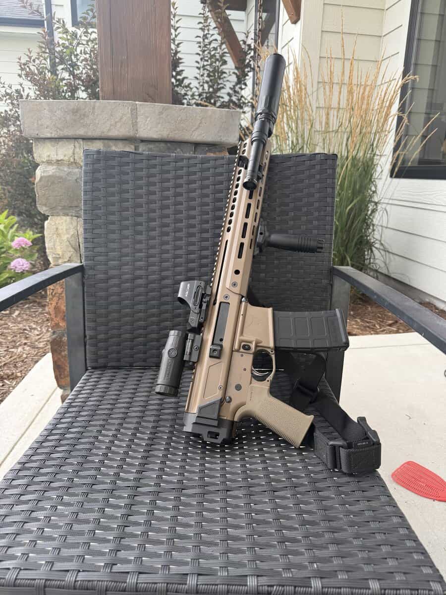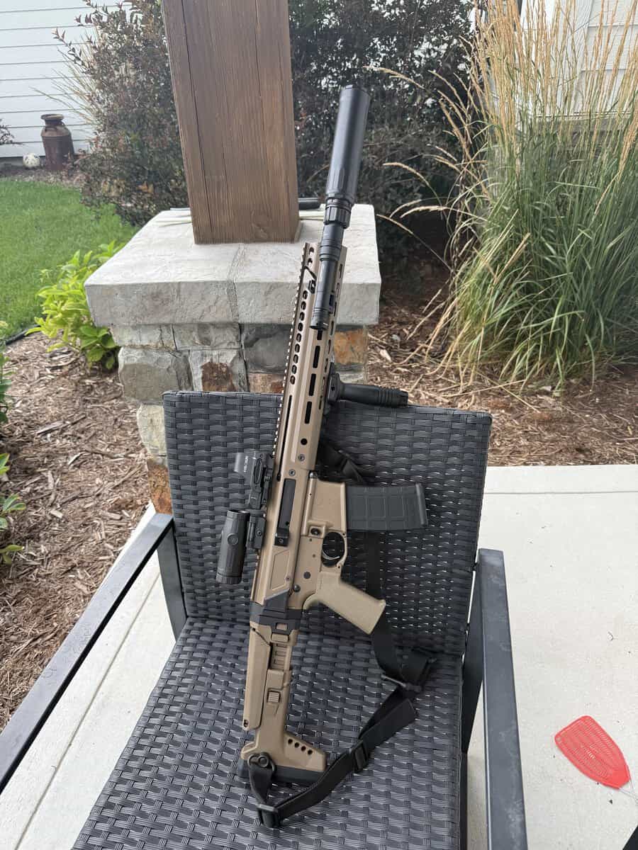 PSA Jakl 2.0 chambered in 5.56. Lower round count (350ish), comes with sure fire scout light , Holosun HS510c red dot and Holosun HM3X magnifier and Dead Air Keymo Flash Hider. Knights armament vertical grip, sling and of course the can is not included. $1600 obo. Or $1000 for just the rifle and the A2 flash hider.