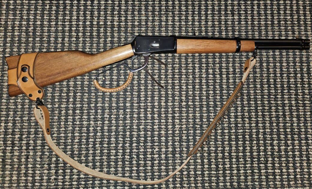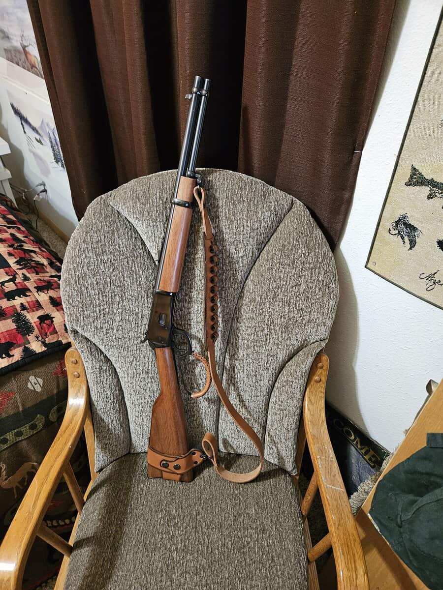 Leather wrapped big loop lever. 16 inch barrel. Leather sling/ extra round carrier. Excellent condition. $799 cash. Price is firm. Trades considered.