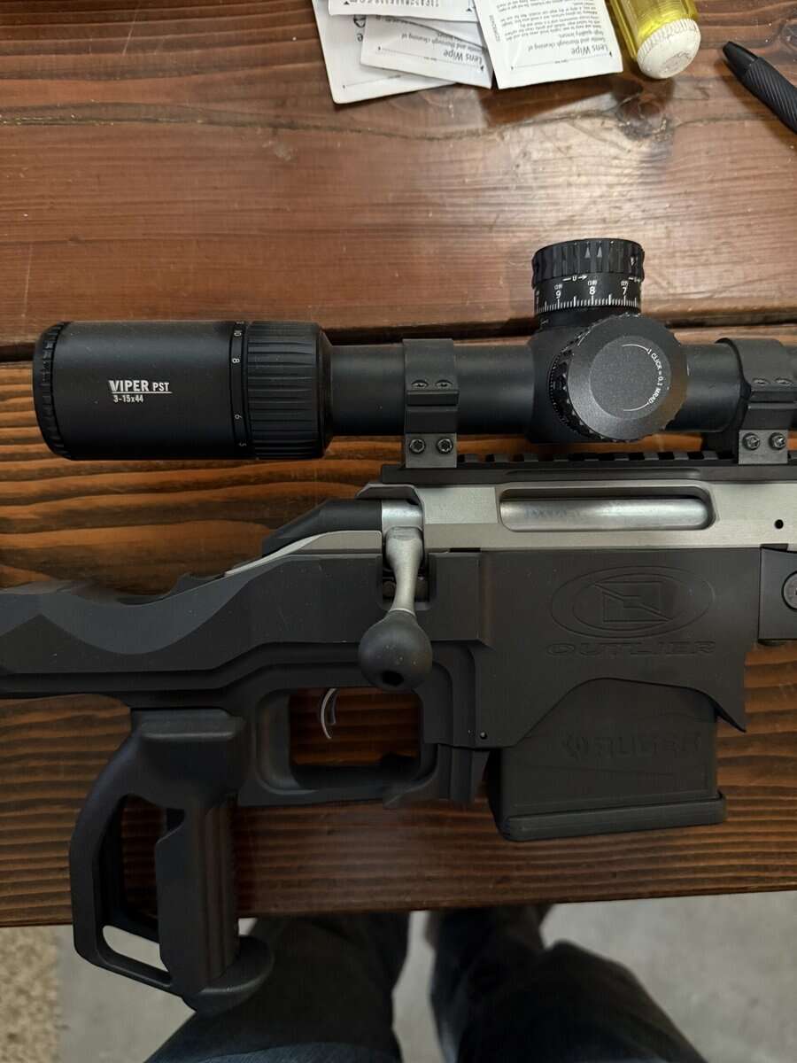 Ruger American (2) with Outlier Chassis, MDT stock and 3-15X44 Vortex Viper. Chambered in 204
