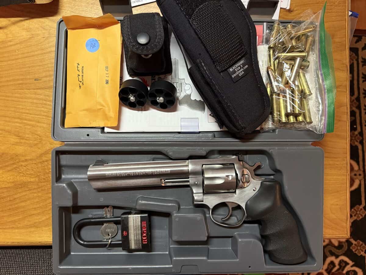 $800 OBO, Ruger GP100 with ~200 rounds fired. Comes with 2 speed loaders, original case, papers, 1st round fired, lock, Blackhawk holster and 44 rounds (mix of hallow points and bear rounds).