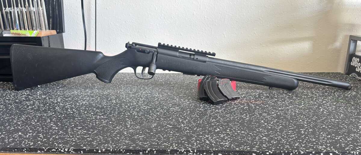 Savage MarkII FV-SR. This model has a threaded heavy fluted barrel,picatinny rail and accu trigger. Also comes with two 5 round and two 10 round magazines.