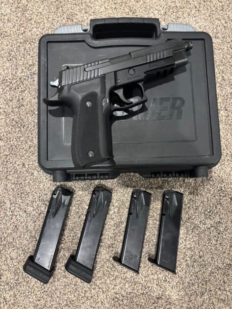 SIG P226 with a SIG threaded barrel (lost the thread protector) with 2 x 15 round mags and 2 x 17 round mags.