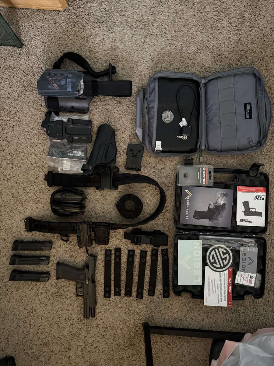Package deal. Everything you see here. Tack driving competition shooting Sig x5 Legion. Optics ready. TXG tungsten-infused grip module. The weight of steel and the flex of polymer, reducing muzzle flip by up to 50%. The trigger pull of the XFIVE LEGION is up to 30% lighter with the skeletonized trigger, which increases shooting speed and accuracy. 3-21 round mags. Original case with all original stuff that came with. Legion only members bag, patch, coin. Electronic HL headphones. Blackhawk double retention thumb release holster with extra pieces. Drop leg “Do not pet” holster. Under belt. Tactical belt. Speed mag holders. Flashlight holder. Belt rings. Punisher back plate installed, original included. 14 lb spring installed 12 lb included. Extra fiber optic rods for front site included. Over $2,000 invested. Asking $1,500 firm. Private sale. Contact me for more pics.