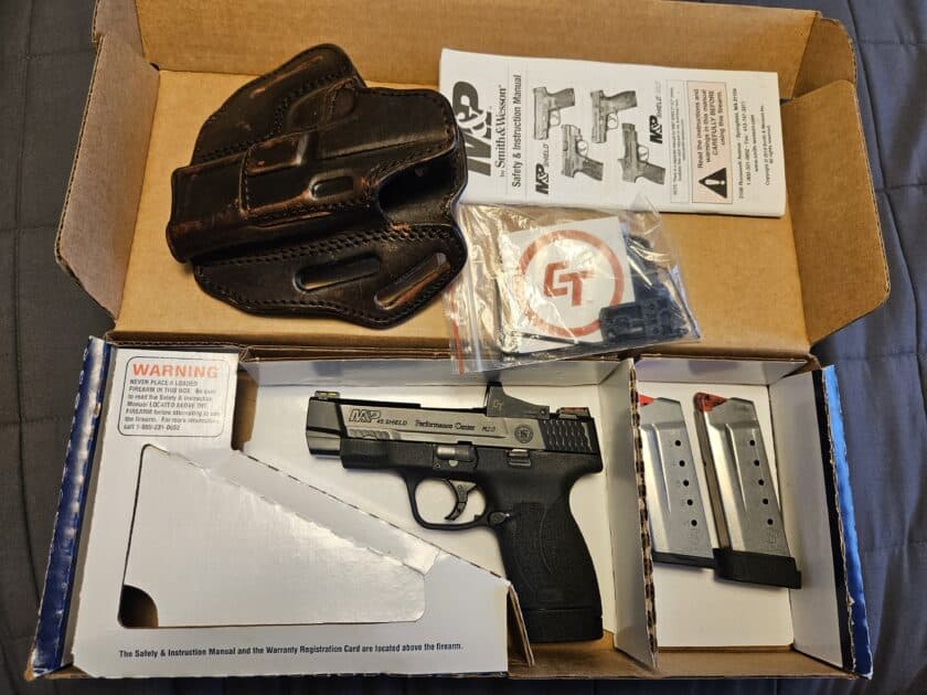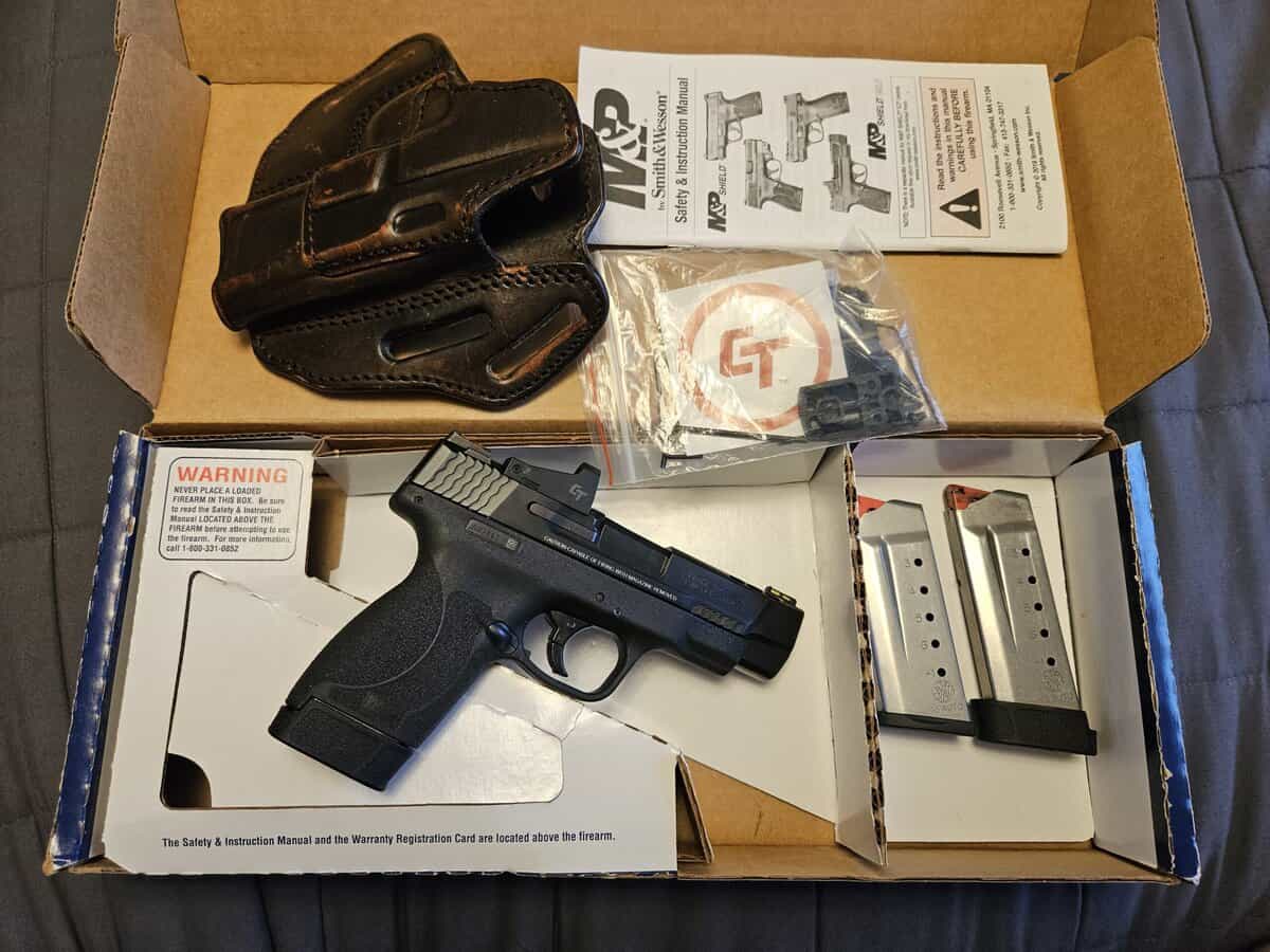 For sale or trade is my Smith and Wesson M&P Shield 45 Performance Center M2.0 4″ barrel. Comes with a Crimson Trace 5 MOA red dot, two 7 round mags with the pinky extension and one 7 round flush fit mag, a Tagua leather pancake owb holster, the original box/paperwork and slide plate with tools. I’m asking $700 or trade of equal value. I’m located in Great Falls, feel free to text me at 4zero6-2zero2-6four6one, thanks!