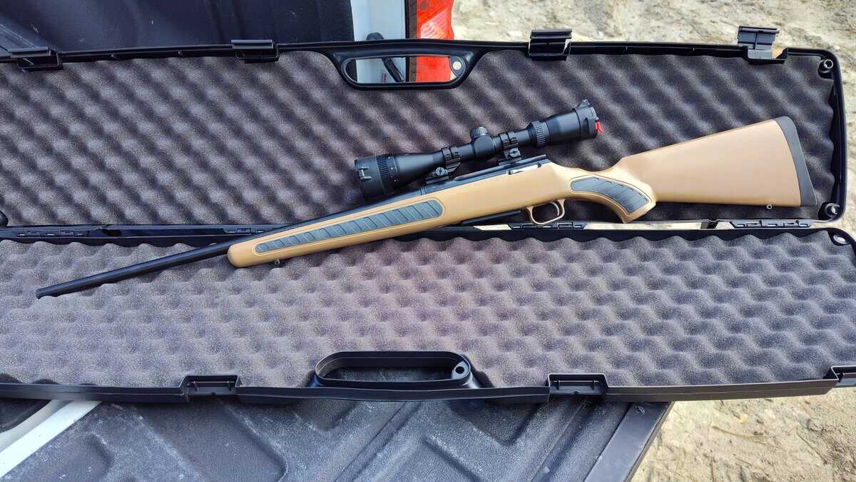 TC Venture in 22/250 wearing a Bushnell Trophy XLT 3-12×56 scope with Butler Creek flip up caps. This is the standard duplex scope, NOT the illuminated reticle version. It’s a nice lightweight rifle that tends to shoot better than I can most days.