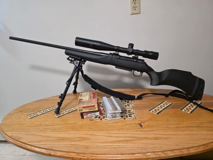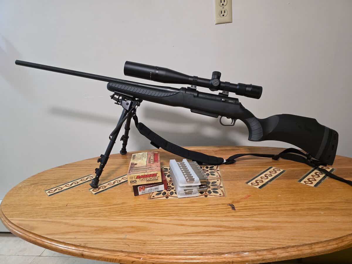 Thompson Dimension in 300 win mag with a vortex viper pa 6.5-20/44 scope, Harris bipod and around 70 rounds of ammo.