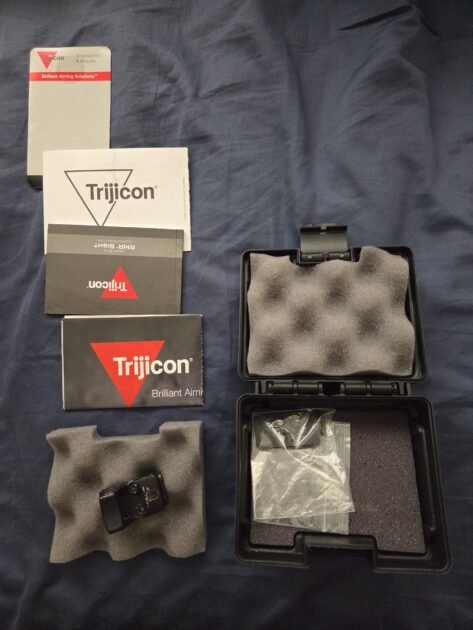 Has some cosmetic scuffs from slide racking but works great. Has a Forward Control OPF-G plate for Glock MOS and a Trijicon brand plate for a HK Vp9 which are included in the price. Also has all the original paperwork and box.