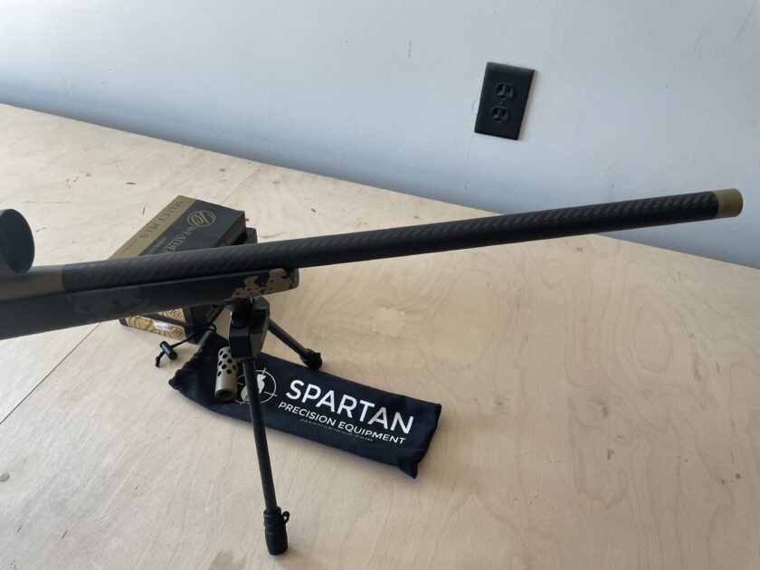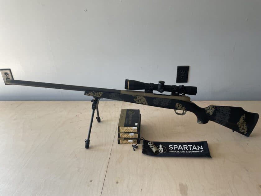 Weatherby mark V Carbon Mark. Chambered in 300 Weatherby. Leupold 30 mm tube VX-3HD 4.5-14×40, leupold turret cut for the factory load pictured. Spartan bipod adapter with bipod. 55 rounds of loaded and if interested 25 peices of factory once fired brass.