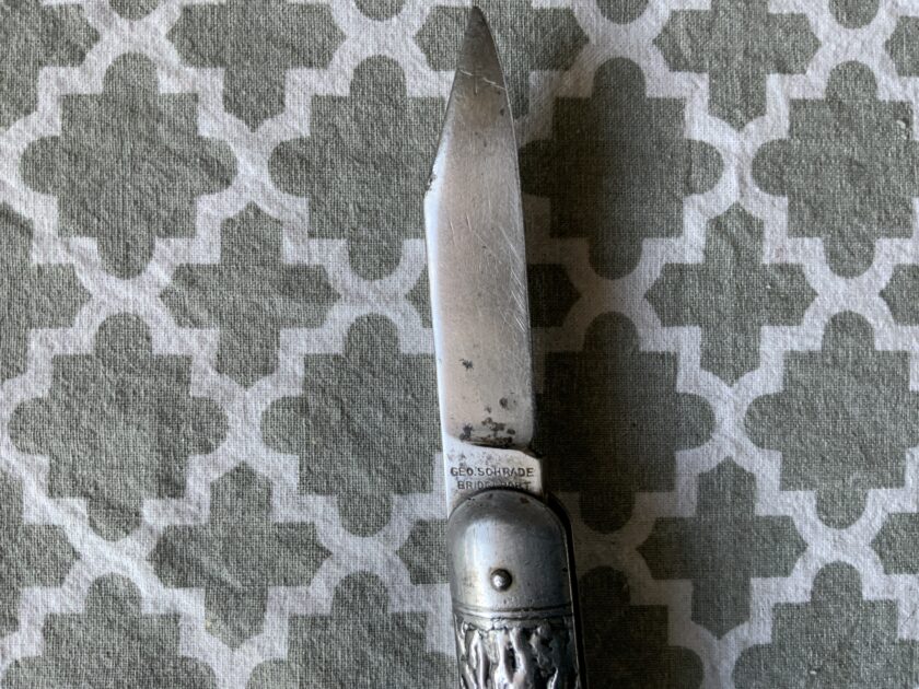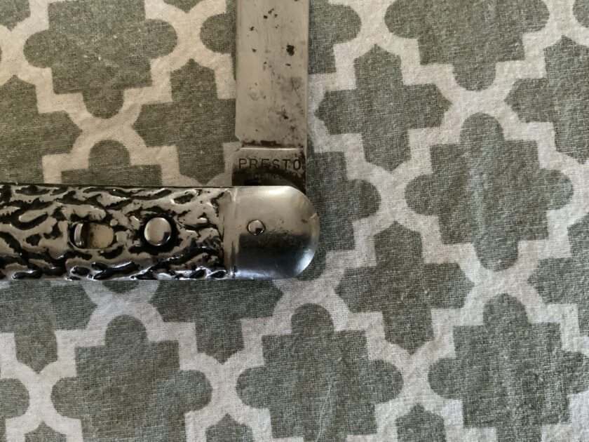 Geo. Shrade presto knife appears to work as it should. Snaps open with push button. Push button and button lock both work.The second brown knife is marked with a U.S. patent number but I cannot find a makers mark on it. The springs appear to be working on this knife but blades do not snap all the way open when buttons are pushed this knife is also missing a small brass rivet as pictured. Don’t know much about these. Asking $250.00 for the Geo. Shrade and $50.00 for the second knife.