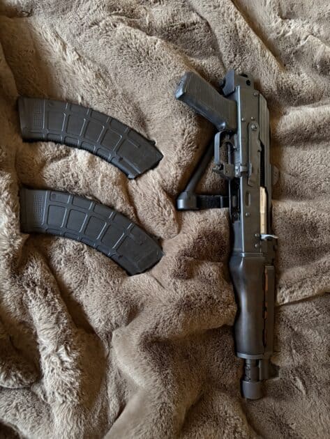 Has a cnc warrior collapsible stock and come with 2 mags and 100 rounds of steel case fmj